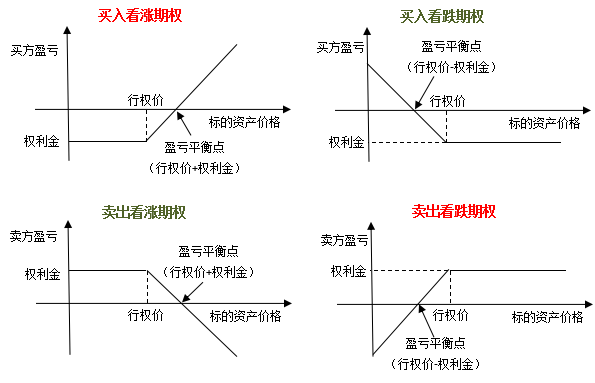 投资者买入或卖出期权开仓之后可以选择对冲平仓或持有至到期。在到期日,我们可以根据标的资产价格和行权价的关系来分析盈亏,也就是通常所说的到期日盈亏。四种基本交易的到期日盈亏如下图: