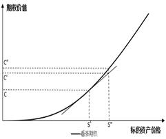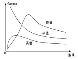 从图一可以看出,当标的价格从S’增加到S”,Delta中性策略所设定的期权价格从C变成C’,而实际上期权价格发生的变化是从C增加至C”。因此,当投资者在做套期保值时,期权价格与股票价格之间的关系(即曲线的曲度)会在操作结果中引起误差,图形的弯曲程度越大,误差就越大,而Gamma正是此曲度的度量值。在图中,Gamma就是切线之上的曲线部分,投资者在进行期权交易时,必需了解Gamma的风险,消除这类估计误差。Gamma的风险可以从它的取值大小上来看。当Gamma的绝对值很小时,表明Delta的变化速度很慢,此时,投资者进行的Delta中性交易不需要调整太频繁。但是如果Gamma的绝对值很大时,表明Delta的变化速度非常快。此时,时间对于期权价格的作用很强,Delta中性交易组合策略需要及时调整,否则会存在很大风险。另外从期权价值来看,一般情况下,如图二,随着到期日的临近,深度实值和深度虚值的期权Gamma值几乎为0,而平值期权的Gamma会加速上升,在到期时,平值期权的Gamma值达到最大。尤其注意的是那些短期平值期权,因为Gamma值很高,期权的头寸对于标的资产价格的变动非常敏感,很可能会导致Delta中性策略失效。