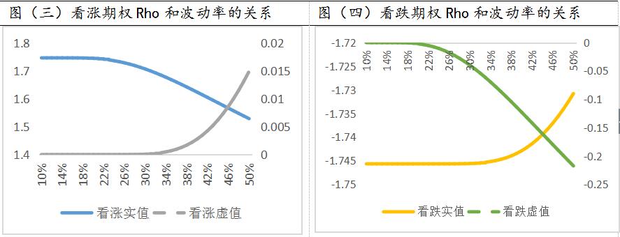 Rho值的大小受到期时间、标的资产价格、波动率的影响。不管是看涨期权还是看跌期权,随着到期日的不断临近,Rho值逐渐趋向于0。不同之处在于看涨期权Rho值非负,而看跌期权Rho值非正。这也表明了,离到期日越远,Rho的绝对值越大,因此正如开篇提到的一样,对于LEAPS的交易,Rho值仍然不可以忽略。从图(一)我们可以看出实值期权Rho的绝对值最大,虚值最小。对于这一规律,我们可以这样理解:实值期权价格较高,需要的投资资金较大,因此对无风险率更加的敏感,所以Rho的绝对值更大。另外,从图(二)我们很容易看出标的资产价格越大,Rho值越大。期权Rho值与波动率之间的关系较为复杂,正如图(三)和图(四)所示,实值期权Rho绝对值与波动率负相关,虚值期权Rho绝对值与波动正相关。