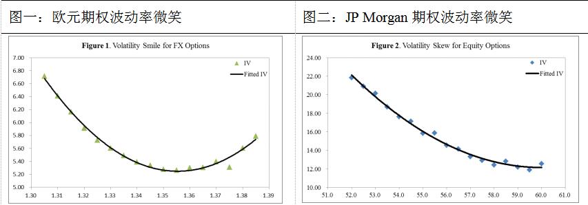 对于股票期权,我们也可以观测到类似于外汇期权中体现出来的“波动率微笑”现象。我们计算标的资产为JP Morgan 股票的期权的隐含波动率。计算当日,标的资产的价格为57.23,期权到期日为2014年9月20日。隐含波动率和行权价的对应关系如图二所示。我们不难发现,隐含波动率关于行权价格近似单调递减,这种现象被称为“波动率偏斜(Volatility Skew)”。关于“波动率偏斜”的现象,一种可能的解释是当企业股票价格下跌,企业杠杆上升,这就意味着股票面临相对更高的风险,发生大波动的可能性更大。也有人认为,波动率偏斜的出现是由于基金经理人对卖出高行权价看涨期权和买人低行权价看跌期权的偏好所导致。