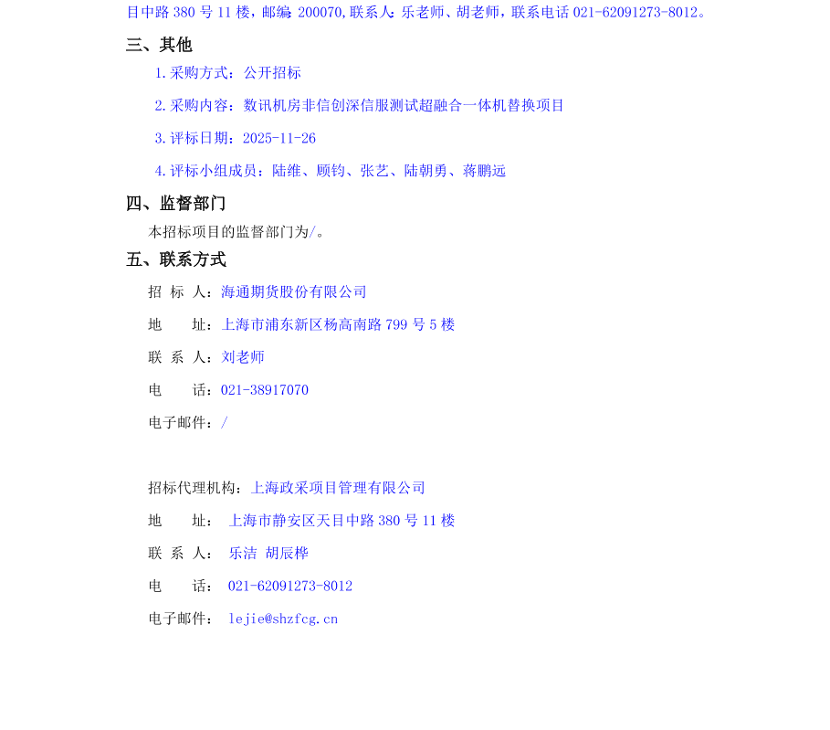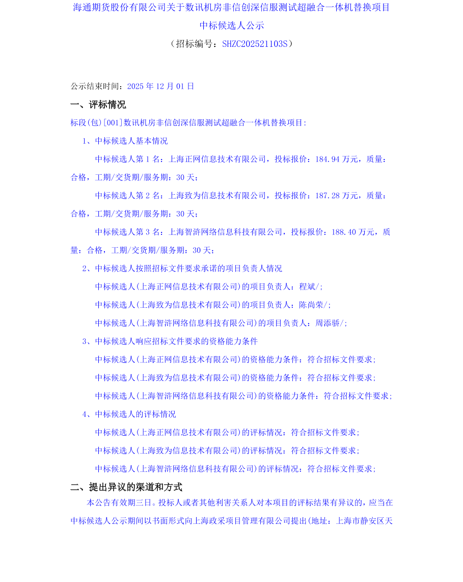 海通期货股份有限公司关于数讯机房非信创深信服测试超融合一体机替换项目中标候选人公示