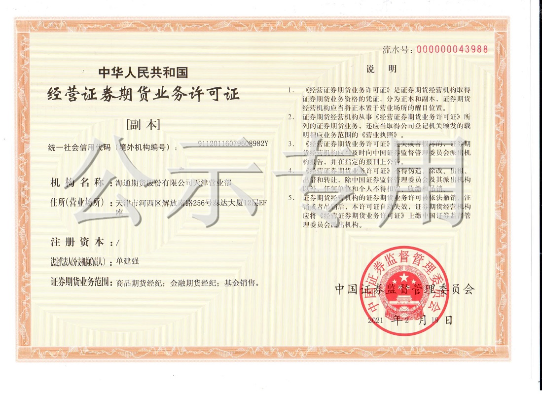 【设立】海通期货天津营业部成立于2013年9月26日,是由中国证监会正式审批,取得《期货经纪业务许可证》的合法期货营业部。【设施】营业部设有开户室、会客室、会议室等场地,布局合理、宽敞明亮。营业部内部设施一流,配置完善,拥有先进的计算机、通讯设施和优良的信息服务。【服务】人员 营业部汇聚行业精英。员工具有丰富金融背景和产业背景,是一支朝气蓬勃、敢于拼搏的团队。员工互相协作、开拓进取,在黑色、化工、私募产品等板块上专人对接,树立服务标杆。营业部以严谨的工作态度和专业精神从开户服务、资金划转、交易通道、研发支持、咨讯提...